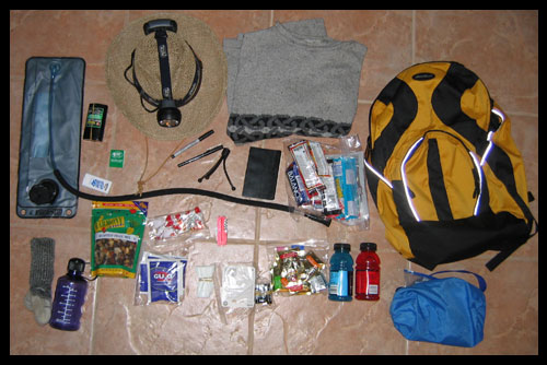 hat, headlamp, sweater, powerbars, power gel, trail mix, powdered